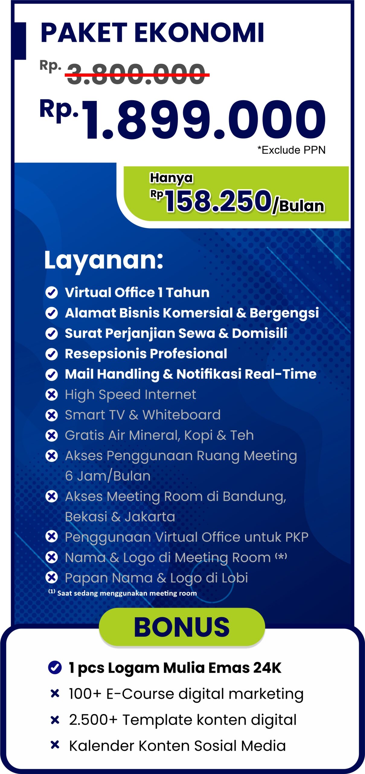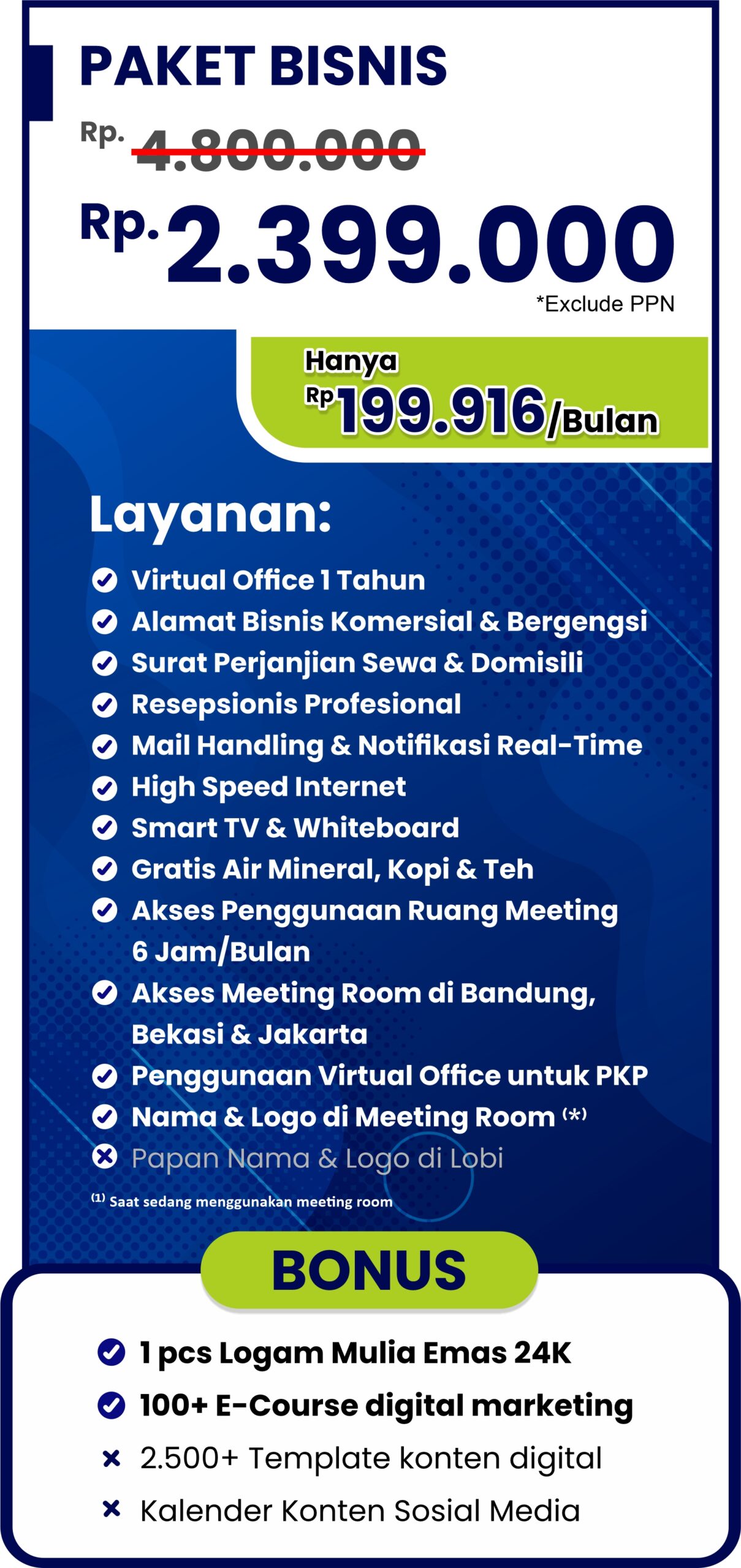 - Virtual Address: Pengguna layanan akan mendapatkan alamat kantor secara virtual. Nantinya, karyawan yang membutuhkan operasional kantor bisa diarahkan untuk menghubungi kontak yang ditujukan ke alamat virtual tersebut.