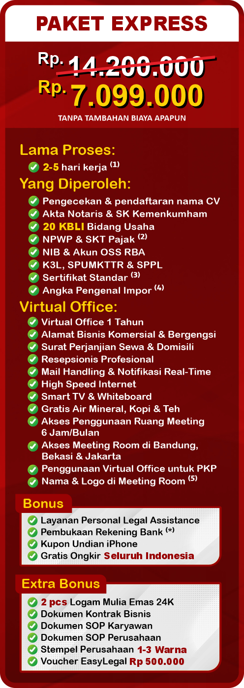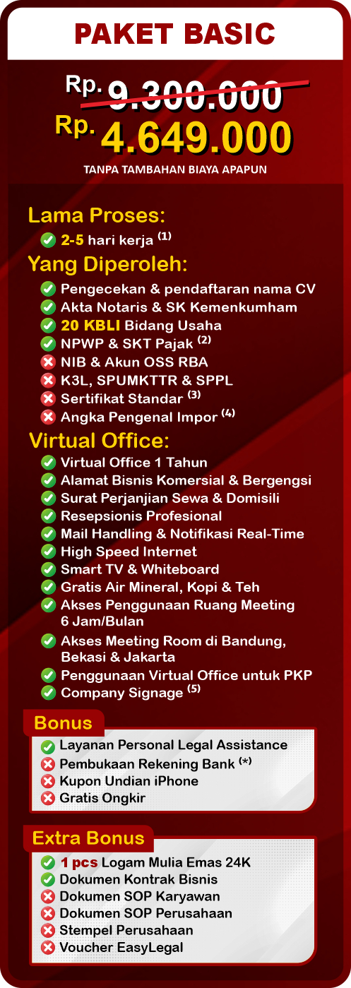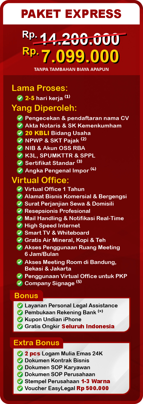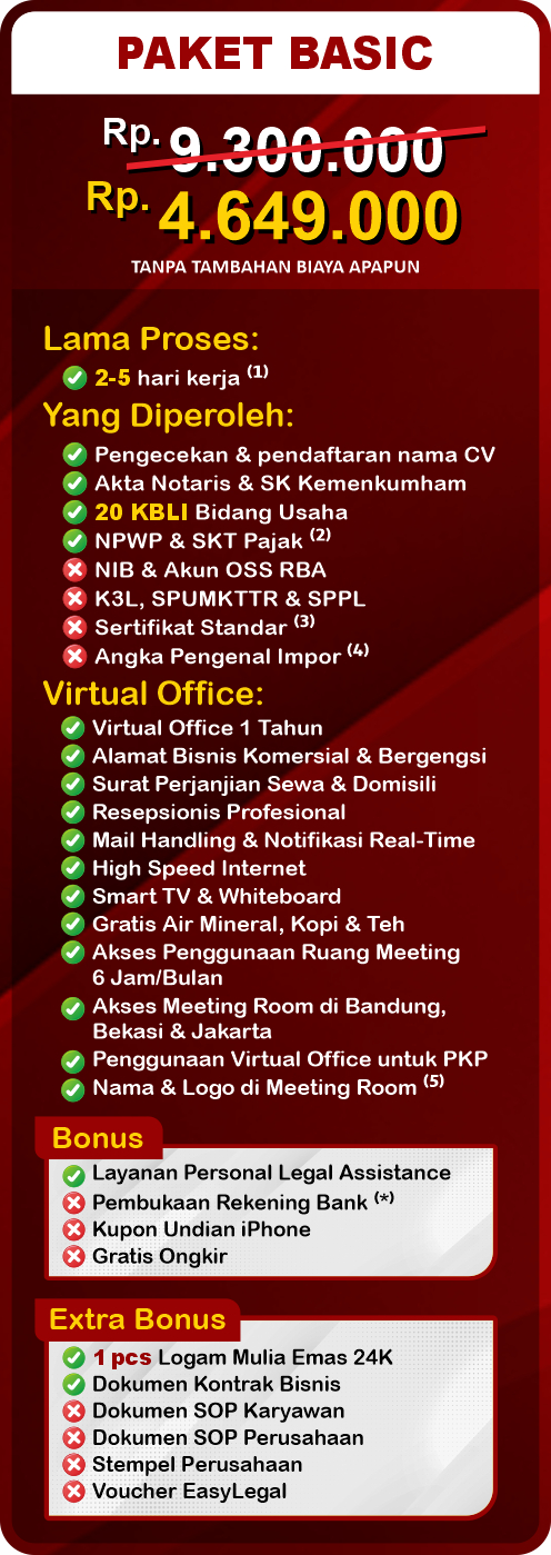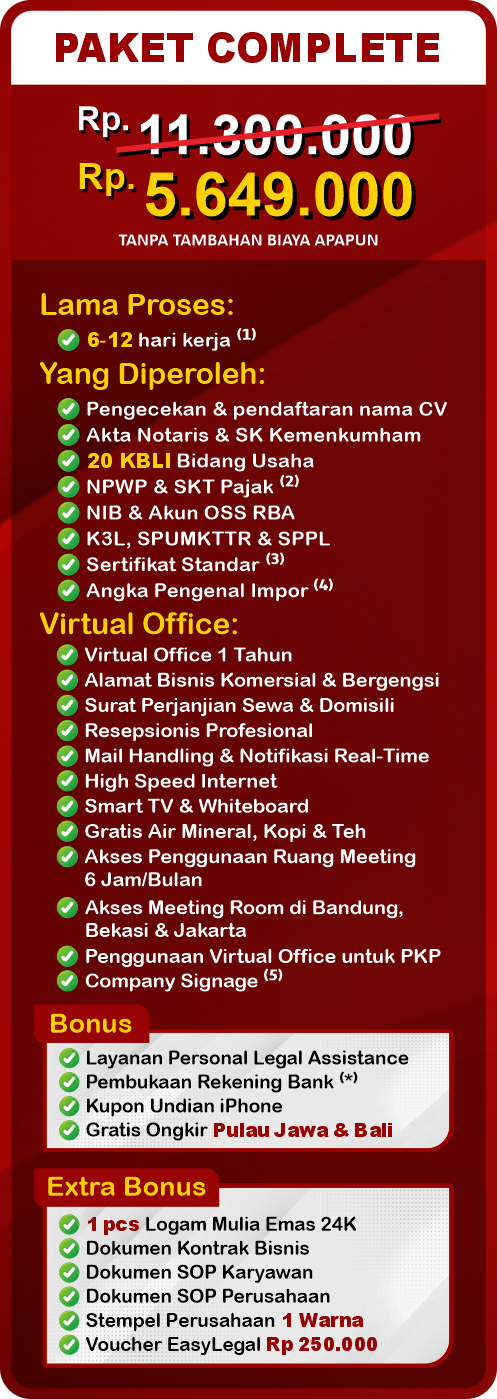 Note:⁽¹⁾ Setelah tanda tangan Minuta Akta | ⁽²⁾ SKT Pajak dikirim oleh KPP dalam 1-3 bulan | ⁽³⁾ Resiko menengah rendah | ⁽⁴⁾ Opsional | ⁽⁵⁾ Saat penggunaan Meeting Room | ⁽*⁾ Syarat & Ketentuan Berlaku