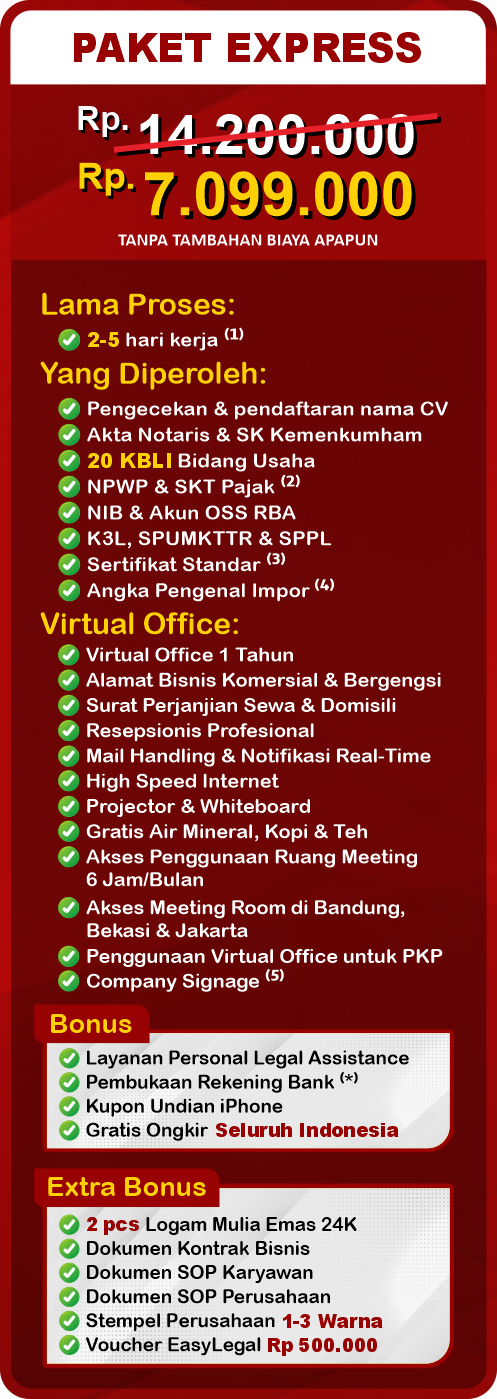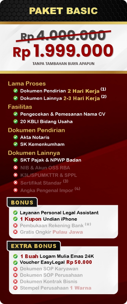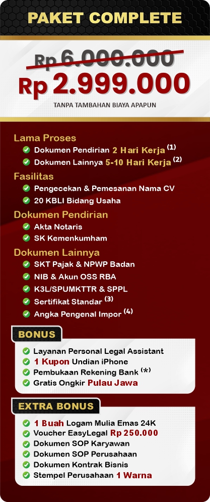 Pendirian CV di Indonesia dapat meningkatkan reputasi bisnis dan menawarkan kemudahan pengelolaan, sekaligus membuka peluang pertumbuhan. Ideal untuk usaha kecil hingga menengah, memungkinkan pengembangan usaha dengan pendekatan yang lebih dinamis dan responsif. EasyLegal sebagai jasa pendirian CV saat ini mengadakan Legal Festival Special Deal, sebagai bentuk dukungan untuk UMKM Indonesia.