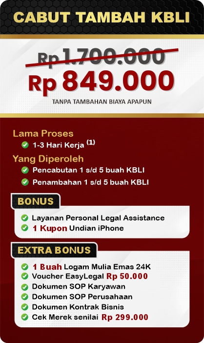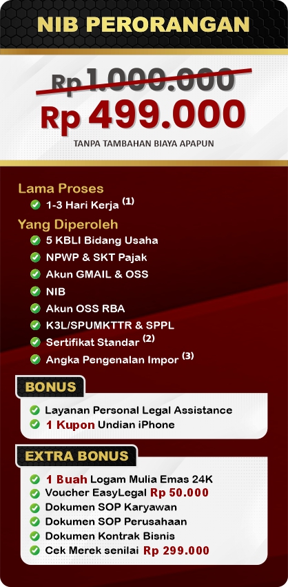 EasyLegal saat ini mengadakan Legal Festival Special Deal, sebagai bentuk dukungan untuk UMKM Indonesia. Dapatkan Diskon 50% untuk pembuatan NIB & OSS RBA. Ambil segera kesempatan ini, kuota terbatas!