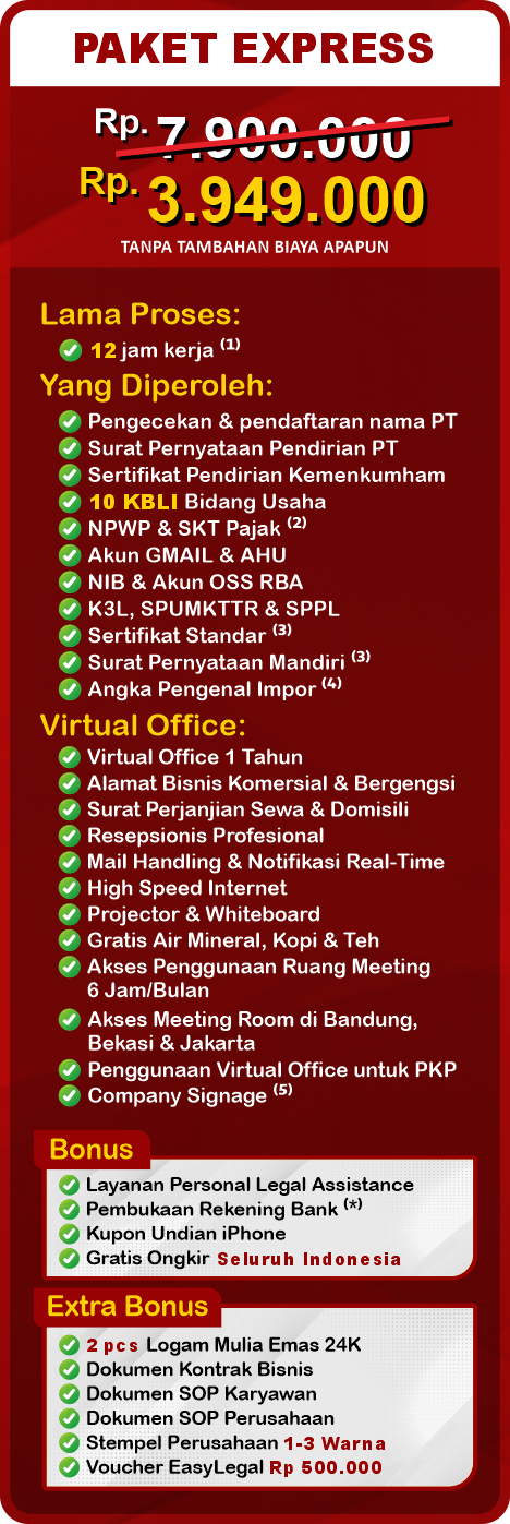 Pendirian PT Perorangan di Indonesia dapat meningkatkan reputasi usaha Anda dan mendapatkan perlindungan hukum. Sangat cocok untuk Anda yang ingin kontrol penuh atas usaha dan menginginkan pertumbuhan bisnis yang lebih cepat. EasyLegal sebagai jasa pembuatan PT Perorangan saat ini mengadakan Legal Festival Special Deal, sebagai bentuk dukungan untuk UMKM Indonesia.