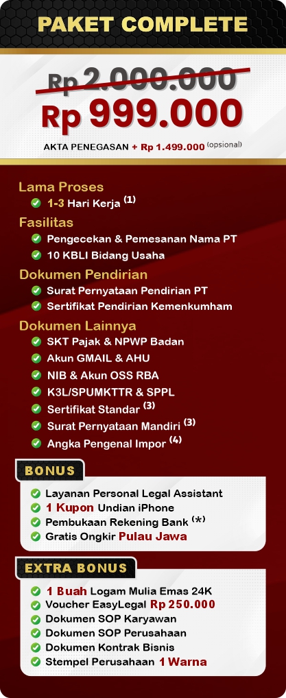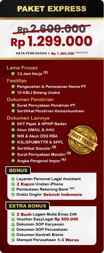 Pendirian PT Perorangan di Indonesia dapat meningkatkan reputasi usaha Anda dan mendapatkan perlindungan hukum. Sangat cocok untuk Anda yang ingin kontrol penuh atas usaha dan menginginkan pertumbuhan bisnis yang lebih cepat. EasyLegal sebagai jasa pembuatan PT Perorangan saat ini mengadakan Legal Festival Special Deal, sebagai bentuk dukungan untuk UMKM Indonesia.