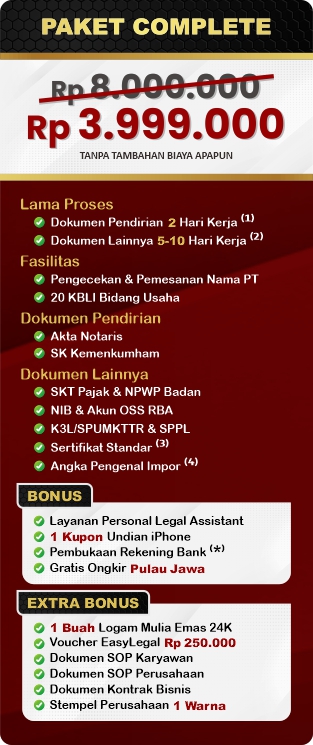 Pendirian Perseroan Terbatas (PT) di Indonesia tidak hanya meningkatkan reputasi bisnis Anda, tetapi juga memberikan perlindungan hukum serta membuka peluang untuk pertumbuhan dan perkembangan lebih lanjut. EasyLegal sebagai jasa pembuatan PT saat ini mengadakan Legal Festival Special Deal, sebagai bentuk dukungan untuk UMKM Indonesia.