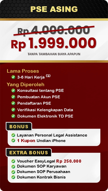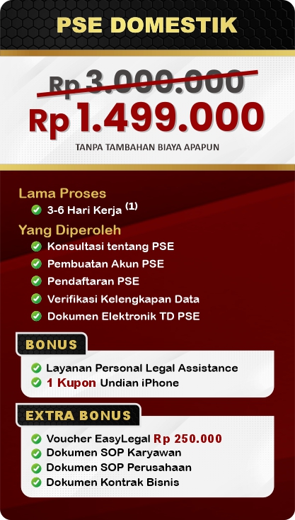 EasyLegal saat ini mengadakan Legal Festival Special Deal, sebagai bentuk dukungan untuk UMKM Indonesia. Dapatkan Diskon 50% untuk pendaftaran PSE. Ambil segera kesempatan ini, kuota terbatas!